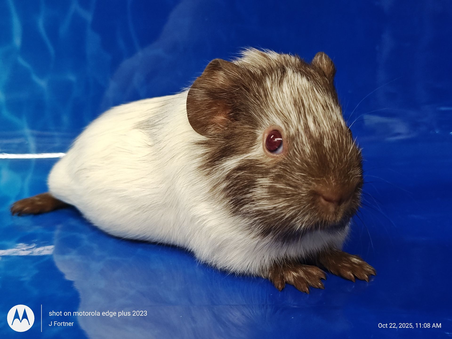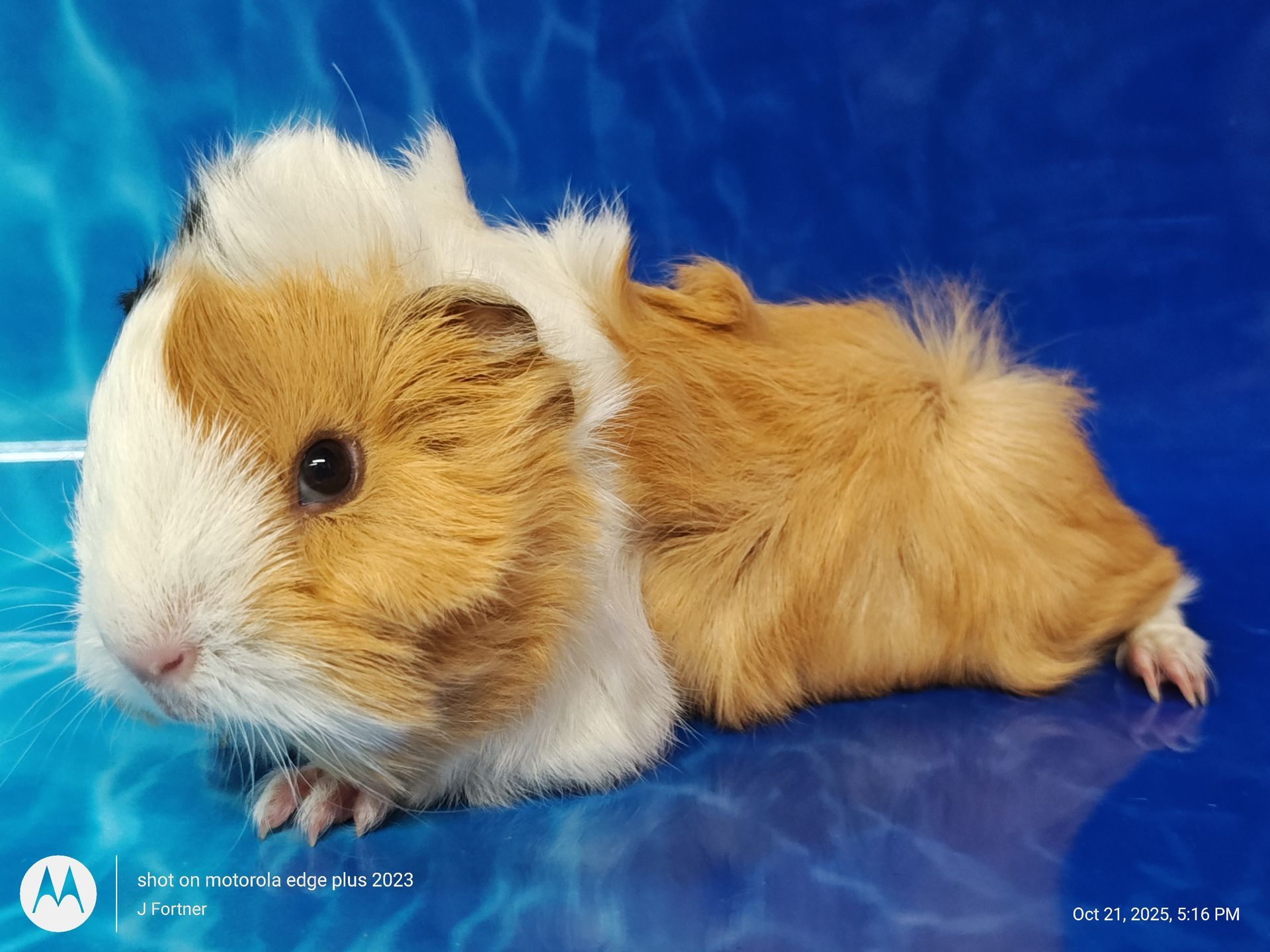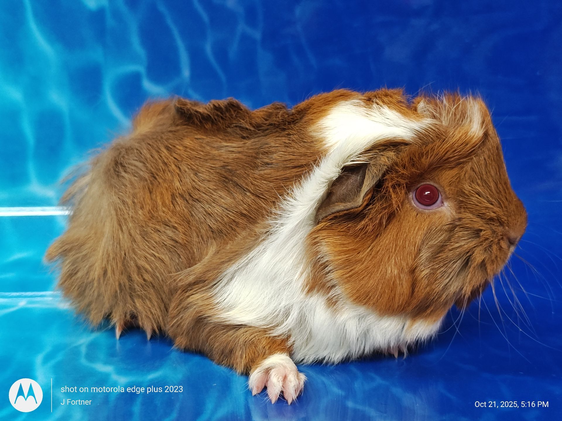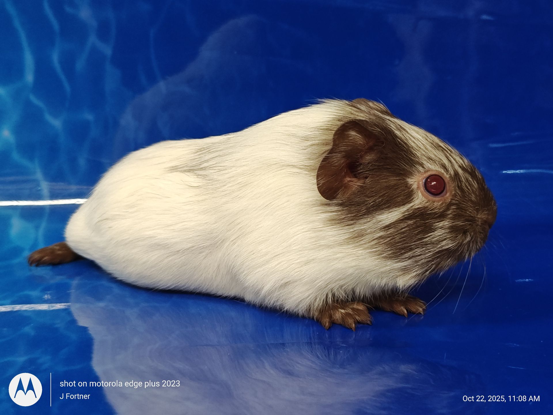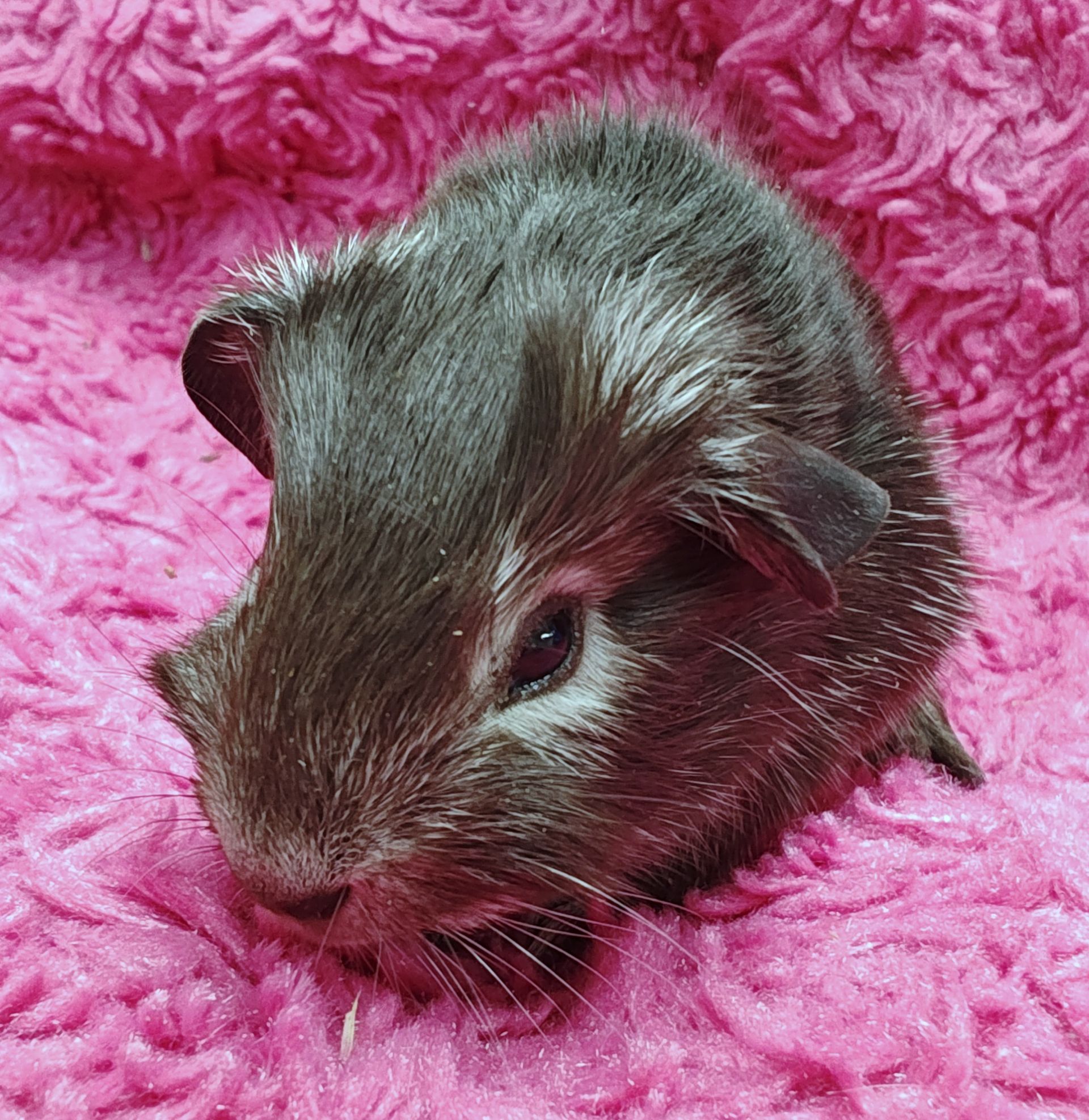 American & Martin/Fox/Tan Pattern & Agoutis (all are short Smooth Haired Cavys) American California & Satin's (Satin is a "satin" guinea pig refers to a breed with a distinctive, glossy, almost glass-like sheen on their coat due to a genetic trait causing hollow hair shafts, giving a unique reflective appearance) & Dalmatian ( Please note* Dal's, Roan's & Satin's should not be bred directly together)